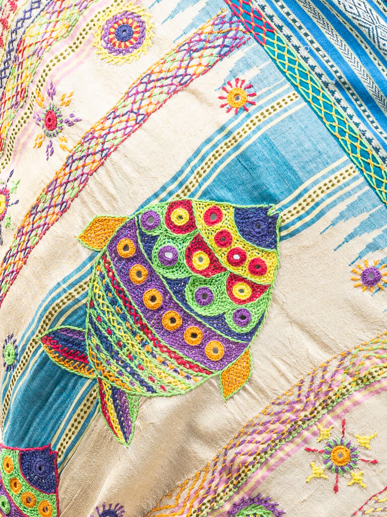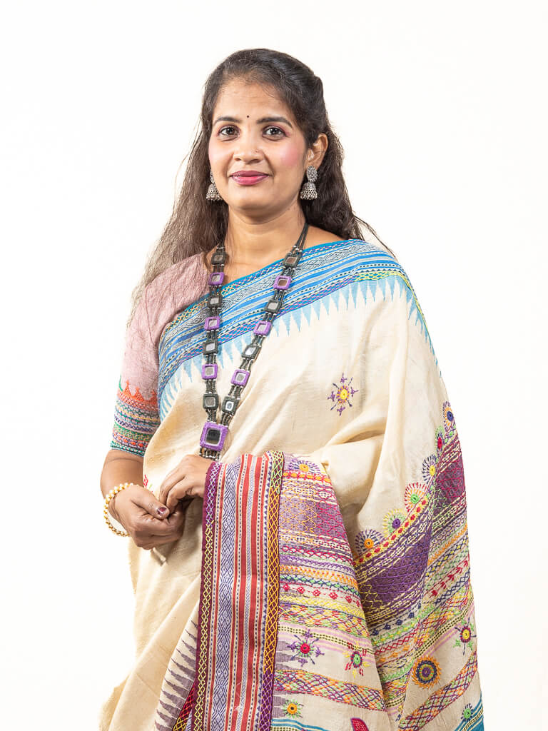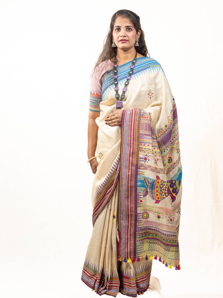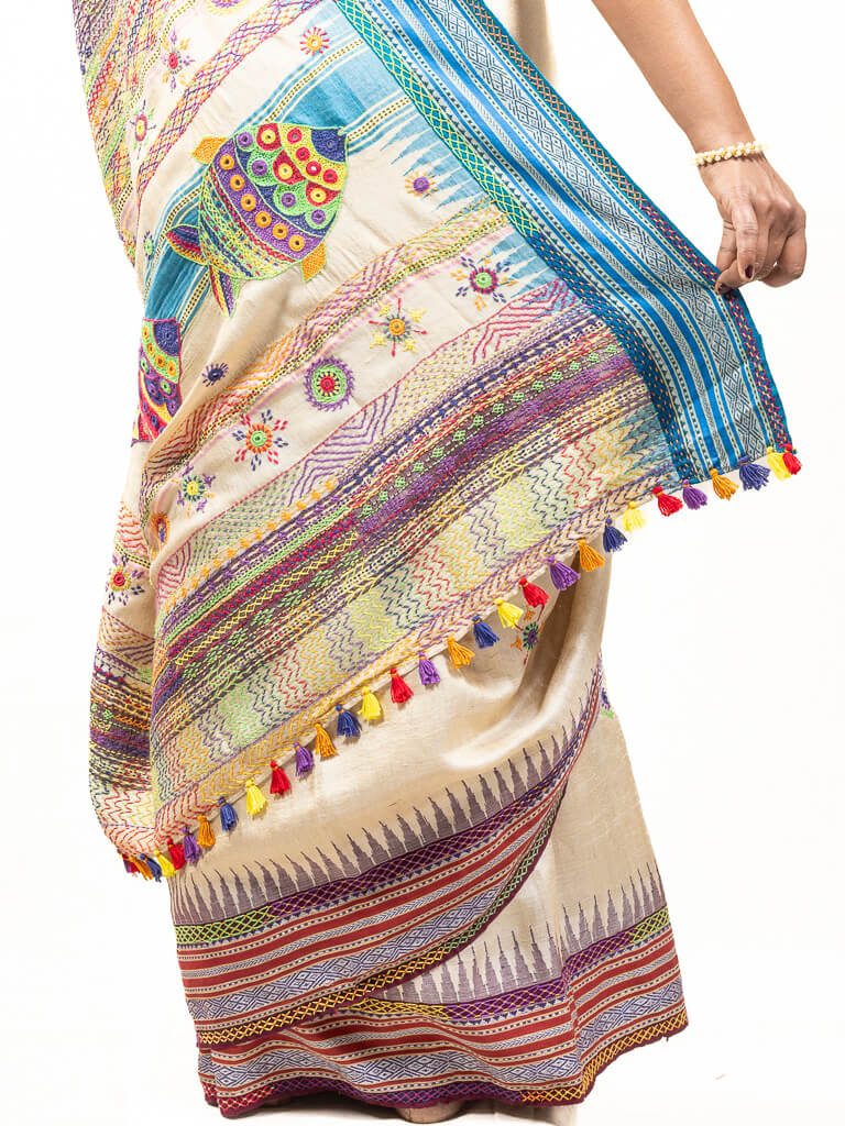 Handloom Beige with blue ganga jamuna border tussar silk saree with Sandur lambani embroidery