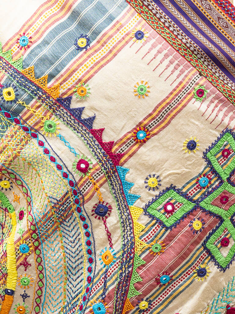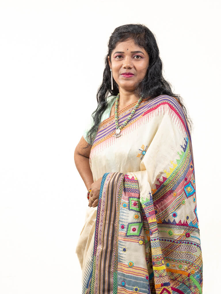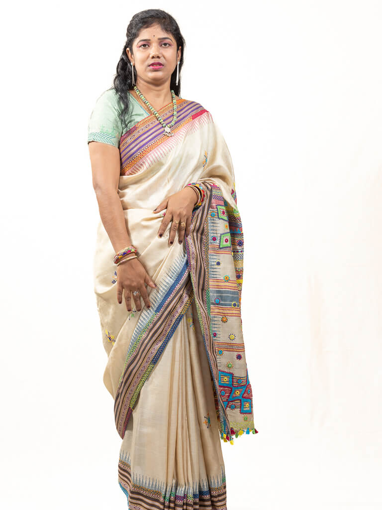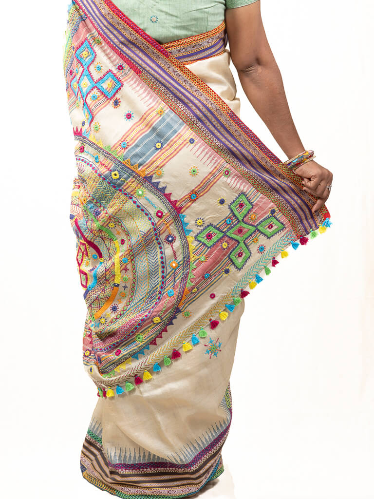 Handloom Beige with blue ganga jamuna border tussar silk saree with Sandur lambani embroidery
